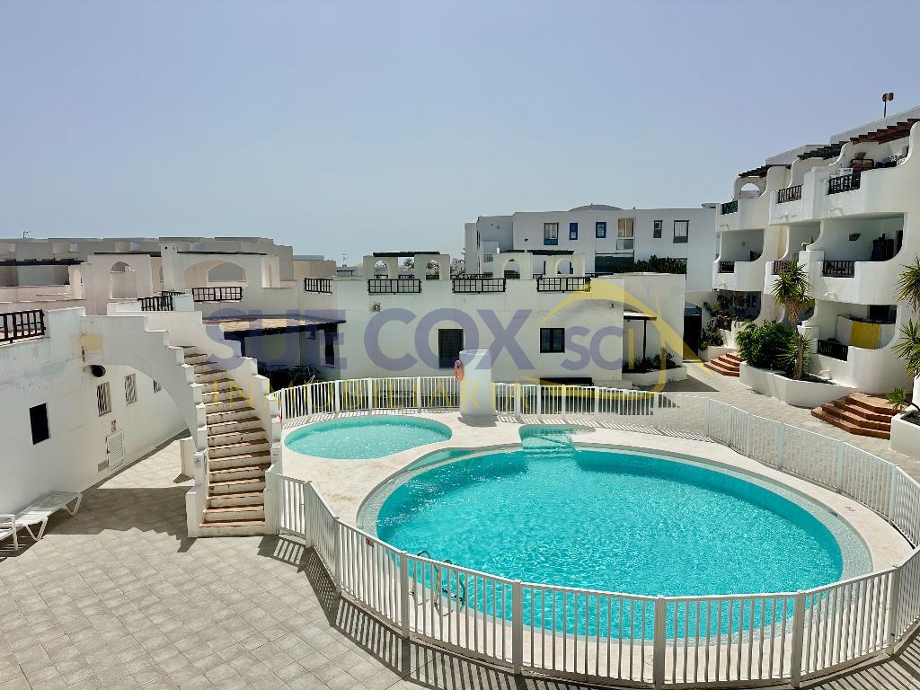 Sue Cox Inmobiliaria is pleased to offer for sale this well presented first floor apartment on the Golden complex in Costa Teguise. The apartment comprises of an open plan kitchen into the living area with sliding patio doors out to the terrace which has been partly enclosed to provide an additional protected seating area with further sliding patio doors overlooking the communal pool.