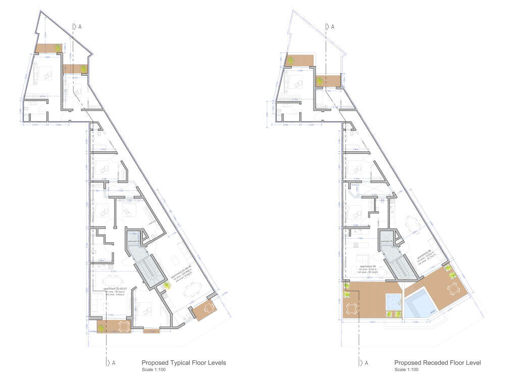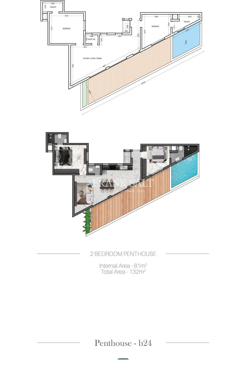 Brand new corner development currently under construction and expected to be completed by mid 2025. This seventh-floor level two-bedroomed PENTHOUSE, which is finished excluding bathroom and internal doors, consists of an open plan kitchen, living, dining leading out onto a large front terrace with pool area, two double bedrooms, both with ensuites and a guest toilet. Optional garages available.